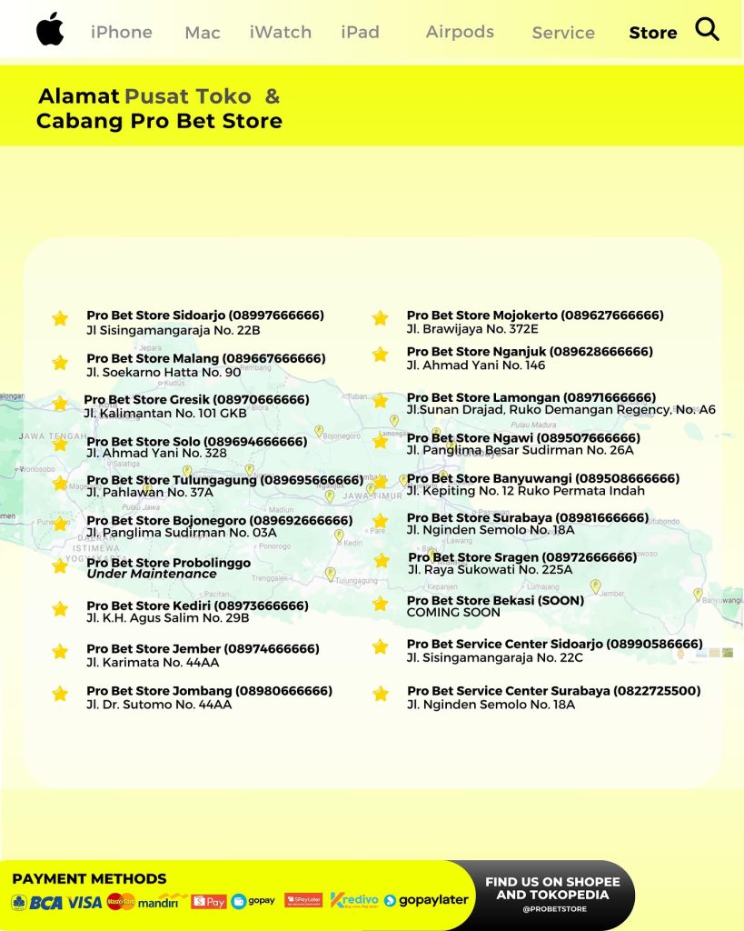 Dengan jaringan cabang yang luas dan terus berkembang, Pro Bet Store memudahkan kamu untuk mendapatkan produk Apple impian dengan layanan terbaik. Tim sales yang profesional dan berpengalaman siap membantu kamu memilih produk yang sesuai dengan kebutuhan dan budget.